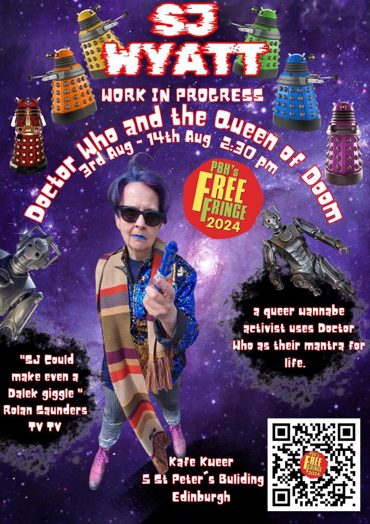 It is a mix of stand-up and comic performance about a journey of a non binary, bisexual bipolar wannabe activist trying to fit into the world through Doctor Who.